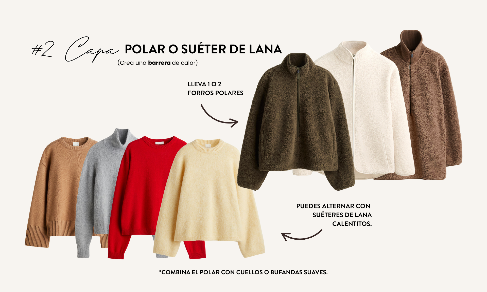 suéteres de lana también son una opción ideal. La lana natural conserva el calor incluso si se humedece y aporta ese encanto acogedor que tanto se disfruta en los países del norte.